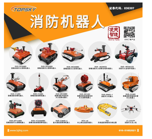 Beijing topsky currently has 5 major series, a total of 15 fire-fighting robots, and has the design and manufacturing capabilities of key components such as chassis, controls, and video water cannons!
