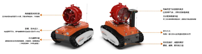 RXR-MC4BD explosion-proof fire-fighting high-expansion foam fire-extinguishing reconnaissance robot is suitable for various large-scale hazardous chemicals, large-span commercial buildings, factories, commercial enterprises, mines, tunnels, subways, warehouses, hangars, ships and other accident rescues. It mainly replaces firefighters’ covering fire fighting operations in flowing fire areas in petrochemical, gas storage tanks and other places.