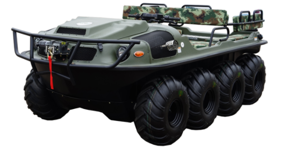 For the purpose of completing reliable emergency rescue in the wild, the amphibious all-terrain vehicle can provide a safe transportation method and a reliable carrier platform. The product can be used in mountain environment, wetland environment, swamp environment, water environment, jungle environment, etc. Under the working environment, continuous operation can be realized all-weather. And can patrol and survey the disaster site, transport the injured, and effectively implement rescue.